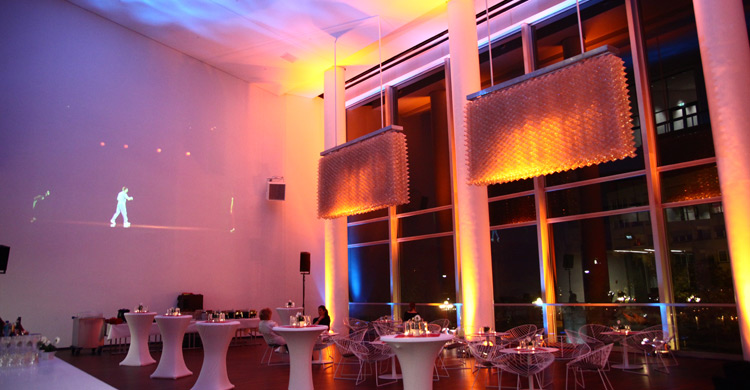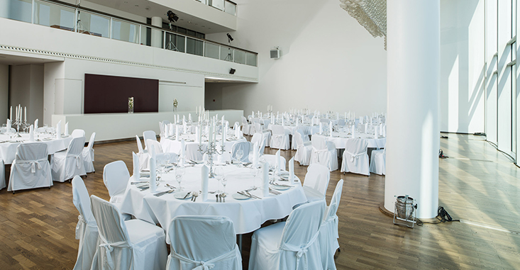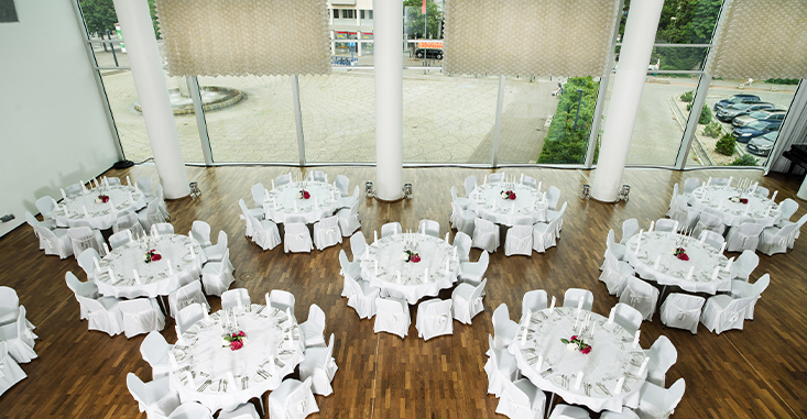 Wie ein Balkon ragt das Gläserne Foyer über den Theater- platz und vermittelt ein unvergleichliches Raumgefühl. Vom eleganten Empfang bis zur ausgelassenen Party, von der Tagung zum Kulturevent ist hier nahezu alles möglich. Durch komplette Tagungs-, Bühnen- und Messetechnik, unabhän- gigen Außenzugang, eigene Küche und eigene sanitäre Anlagen kann das Gläserne Foyer auch unabhängig vom übrigen Haus genutzt werden. Ein multifunktionaler Veranstal- tungsraum im besten Sinne des Wortes.