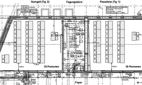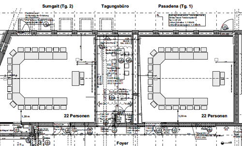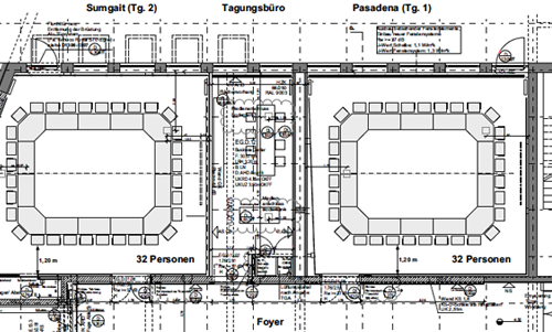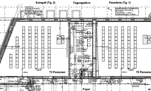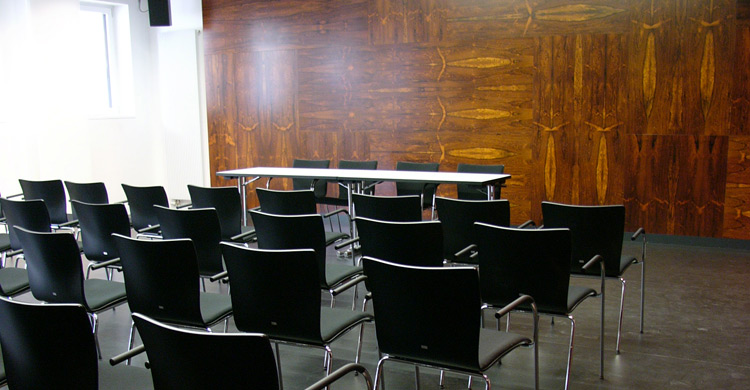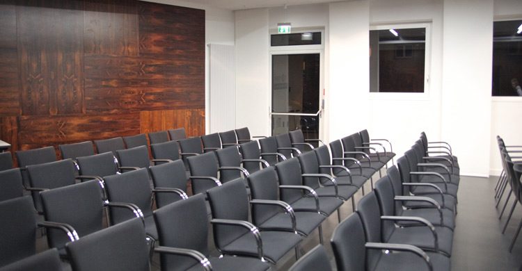 Zwischen den beiden Räumen wurde ein Veranstalterbüro geschaffen, das hinsichtlich seiner technischen Ausstattung keine Wünsche offen lässt. Die vorgelagerte Foyerfläche bietet den idealen Rahmen für die Pausengastronomie oder begleitende Ausstellungen.